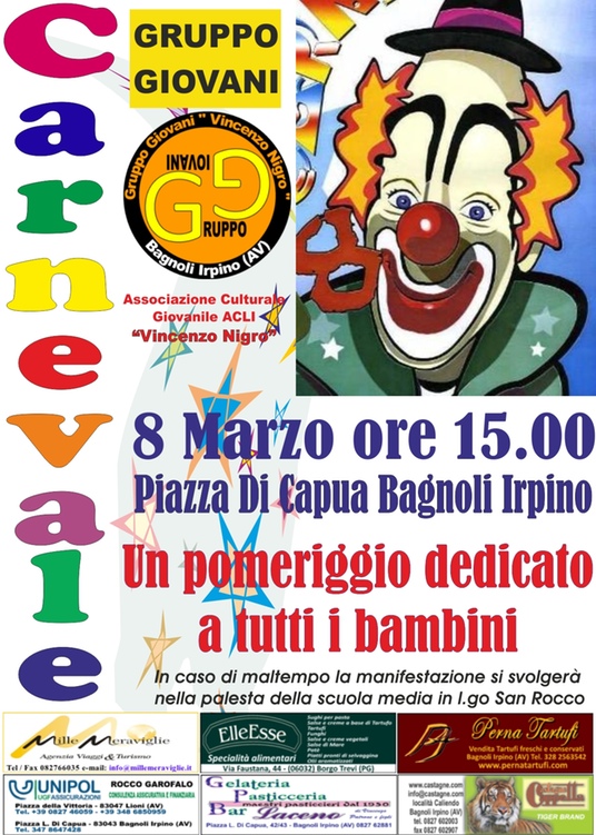 Il Gruppo Giovani “Vincenzo Nigro” organizza il CARNEVALE 2011 a Bagnoli Irpino. La manifestazione è prevista per martedì 8 marzo, in concomitanza con la Festa della Donna, e si svolgerà in Piazza Leonardo Di Capua a partire dalle ore 15,00. Appuntamento della tradizione locale con canti, balli in maschera, giochi e scherzi di ogni tipo. I protagonisti principali della festa saranno I BAMBINI. Gli organizzatori segnalano che in caso di maltempo la manifestazione si svolgerà nella palestra dell’Istituto Comprensivo “M.Lenzi” in Largo San Rocco.