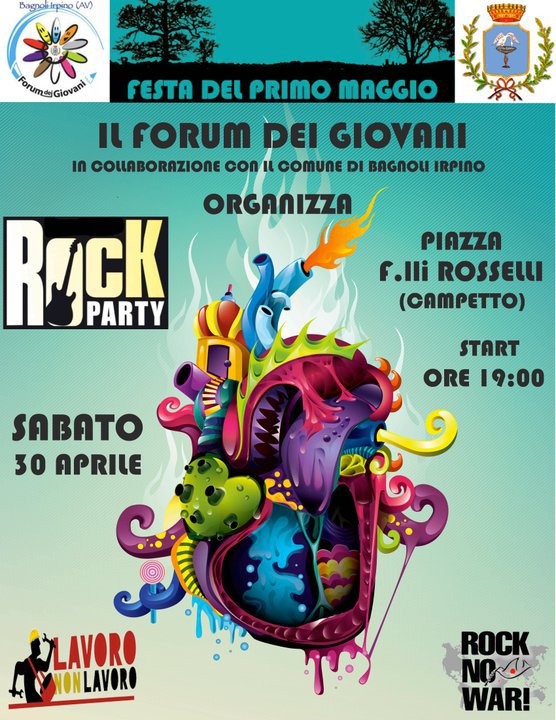 Il FORUM GIOVANI, in collaborazione con il Comune di Bagnoli Irpino, organizza  invece un vero e proprio rock party. Sabato 07 maggio, a partire dalle ore 19:00, tutti in Piazza Fratelli Rosselli (campetto da tennis) dove si esibiranno i seguenti gruppi musicali: Stereo8 –  Jet Pilots – Kundalini Surf – Mololtov. L’evento dovrebbe essere accompagnato da un convegno incentrato sulle problematiche legate al lavoro e al precariato.