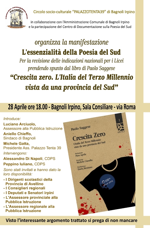 L’Amministrazione comunale di Bagnoli Irpino e l’Associazione Palazzo Tenta 39, insieme al Centro di Documentazione sulla Poesia del Sud, organizzano per il giorno 28 aprile ore 18:00 presso la Sala Consiliare in Via Roma la manifestazione “L’essenzialità della Poesia del Sud. Per la revisione delle Indicazioni nazionali per i Licei”, prendendo spunto dal libro di Paolo Saggese “Crescita zero. L’Italia del Terzo Millennio vista da una provincia del Sud” Delta 3 edizioni.