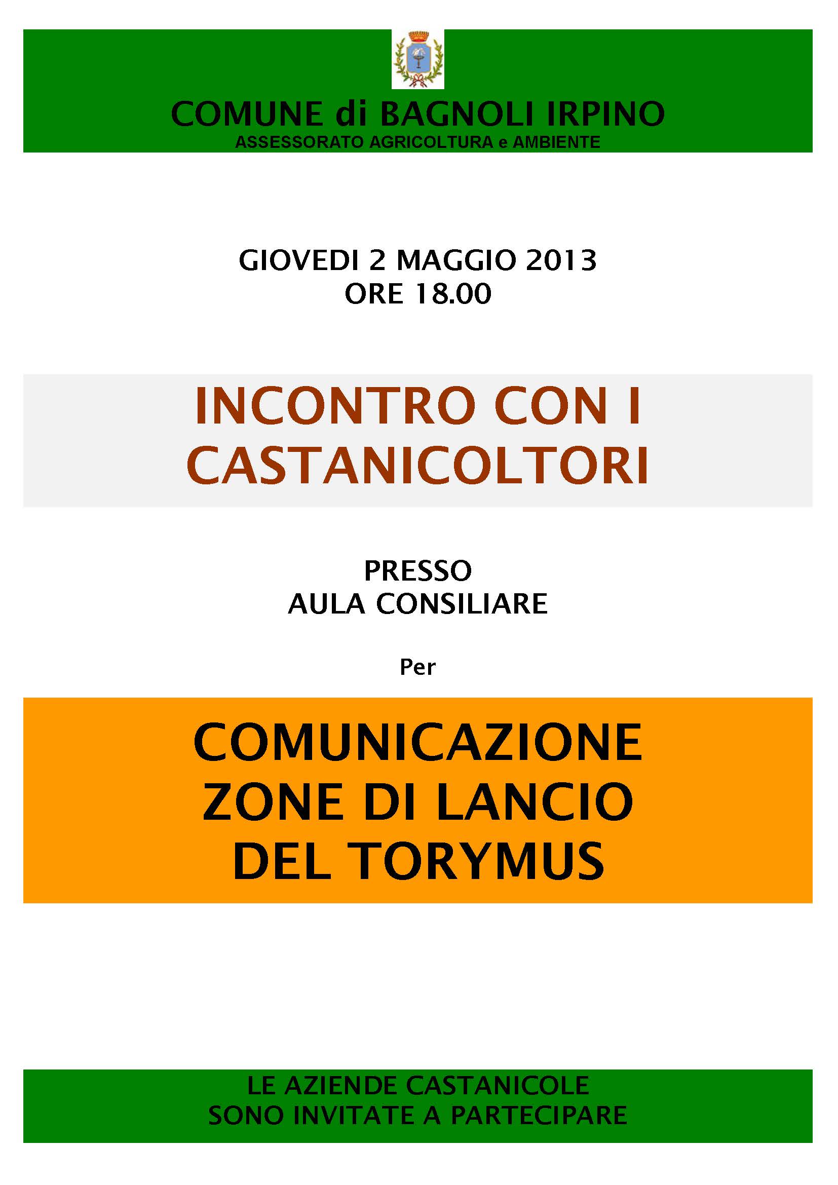 Giovedì 02 maggio 2013 ore 18:00 presso l’Aula Consiliare in Via Roma a Bagnoli irpino l’Assessore all’Agricoltura e Ambiente Luca Branca incontra la cittadinanza sul tema “Zone di lancio del Torymus”. Si discuterà in particolare degli impegni da rispettare nelle aree di lancio, che complessivamente saranno 23, per evitare danni al Torymus. Le aziende castanicole sono invitate a partecipare.