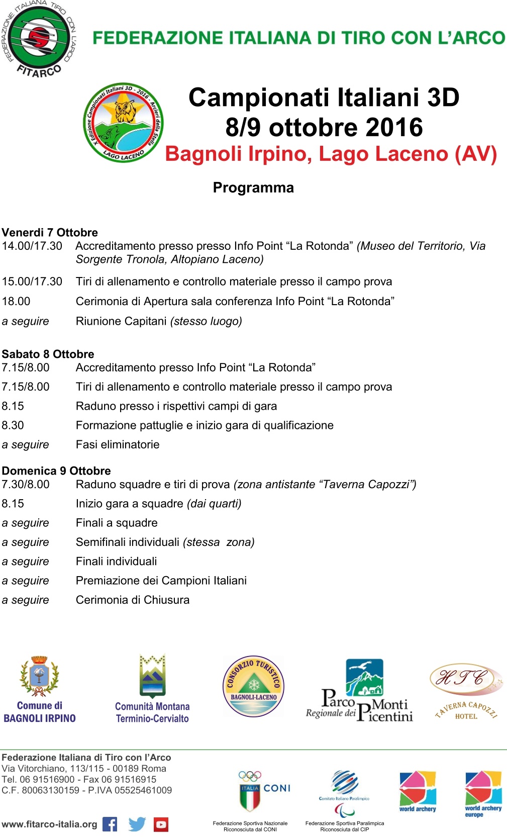 IL COMITATO ORGANIZZATORE – La manifestazione è stata affidata dalla Federazione Italiana Tiro con l’Arco alla Società campana Arcieri della Stella che organizza questo Evento Federale con la collaborazione del Comitato Regionale Fitarco Campania, delle Società Arcieri Vecchio Castello e Arcieri Atlahua, contando anche sul supporto e patrocinio del Comune di Bagnoli Irpino, del Comune di Rotondi, della Comunità Montana Terminio Cervialto e della Proloco “La Lanterna” di Rotondi.